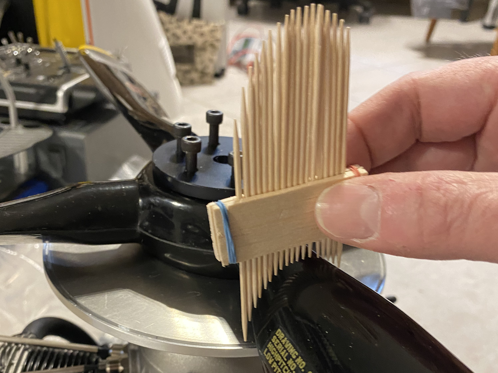 Jeder Modellflieger kennt das Problem... Wie kriege ich die Auschnitte bzw. die Kontur vom Propeller in meinen Spinner. Hier gibt es einen einfachen Trick. Man nehme zwei Balsebrettchen aus der Restekiste und schlitzt mit einem Messer eine Vertiefung von ca. 1mm in der Mitte der Brettchen. Nun nimmt man eine entsprechene Anzahl Holzzahnstocher (hat bestimmt jeder im Schrank liegen), legt diese in die Vertiefung und legt das zweite Brettchen drauf. Zum Schluss wickelt man rechts und links Gummibänder (liegen bestimmt im Schrank bei den Zahnstochern) und schon kann man die Kontur an der Stelle des Propellers abnehmen, an er aus dem Stimmer kommt. Dazu sollte der Propeller auf die Spinnergrundplatte gelegt werden. Nun kann mit Hilfe der abgenommenen Kontur eine Schablone erstellt werden, die auf den Spinner übertragen wird.